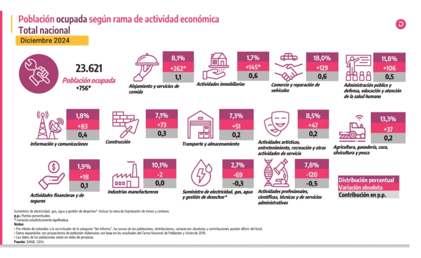 El informe señala que el aumento en la Tasa Global de Participación (TGP) fue, en diciembre 2024, de 0,5 puntos porcentuales (p.p.)., y pasó del 63,8 % al 64,4 %, mientras que el crecimiento en la Tasa de Ocupación (TO) fue de 1,1 puntos porcentuales ubicándose en 58,5 %, mientras que en diciembre de 2023 fue de 57,4 %.