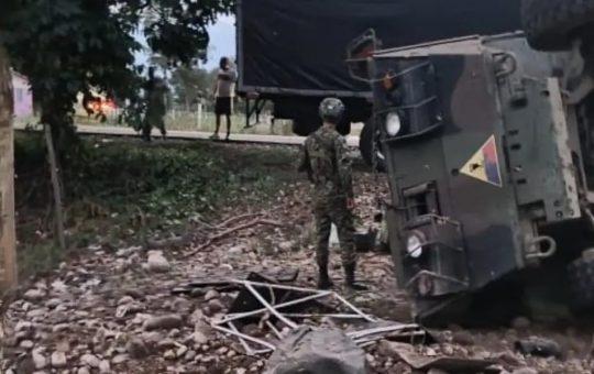 Completamente destruido y volcado lateralmente quedó el vehículo del Ejército en el que se movilizaban los soldados de la Brigada 18,...