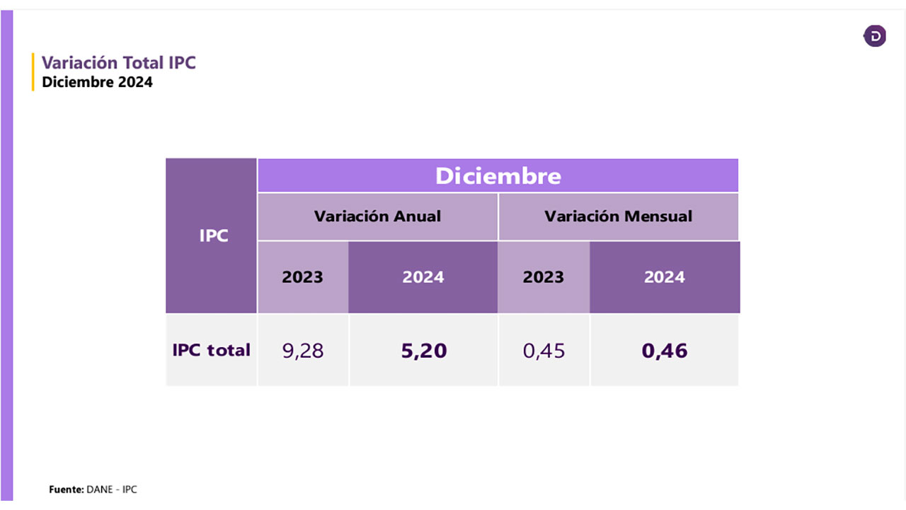 Igualmente, el DANE informó que el comportamiento del IPC en diciembre de 2024 fue de 0,4 %, que se explica, principalmente, por la variación mensual de las divisiones Restaurantes y hoteles (0,9 %) y Alojamiento, agua, electricidad, gas y otros combustibles (0,5 %); Alimentos y bebidas no alcohólicas (0,5 %).