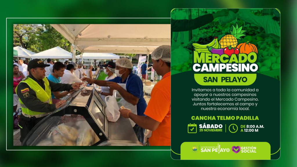 La Alcaldía de San Pelayo realizará este sábado 29 de noviembre una gran jornada del Mercado Campesino, un espacio concebido para fortalecer la economía de las familias rurales, visibilizar su trabajo y promover el consumo de productos frescos, tradicionales y cultivados en el territorio pelayero.