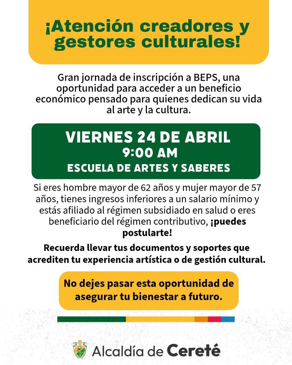 La Alcaldía de Cereté desde la coordinación de cultura invita a todos los creadores y gestores culturales del municipio a participar en la gran jornada de inscripción a los Beneficios Económicos Periódicos (BEPS), una iniciativa que busca brindar apoyo económico a quienes han dedicado su vida al arte y la cultura.