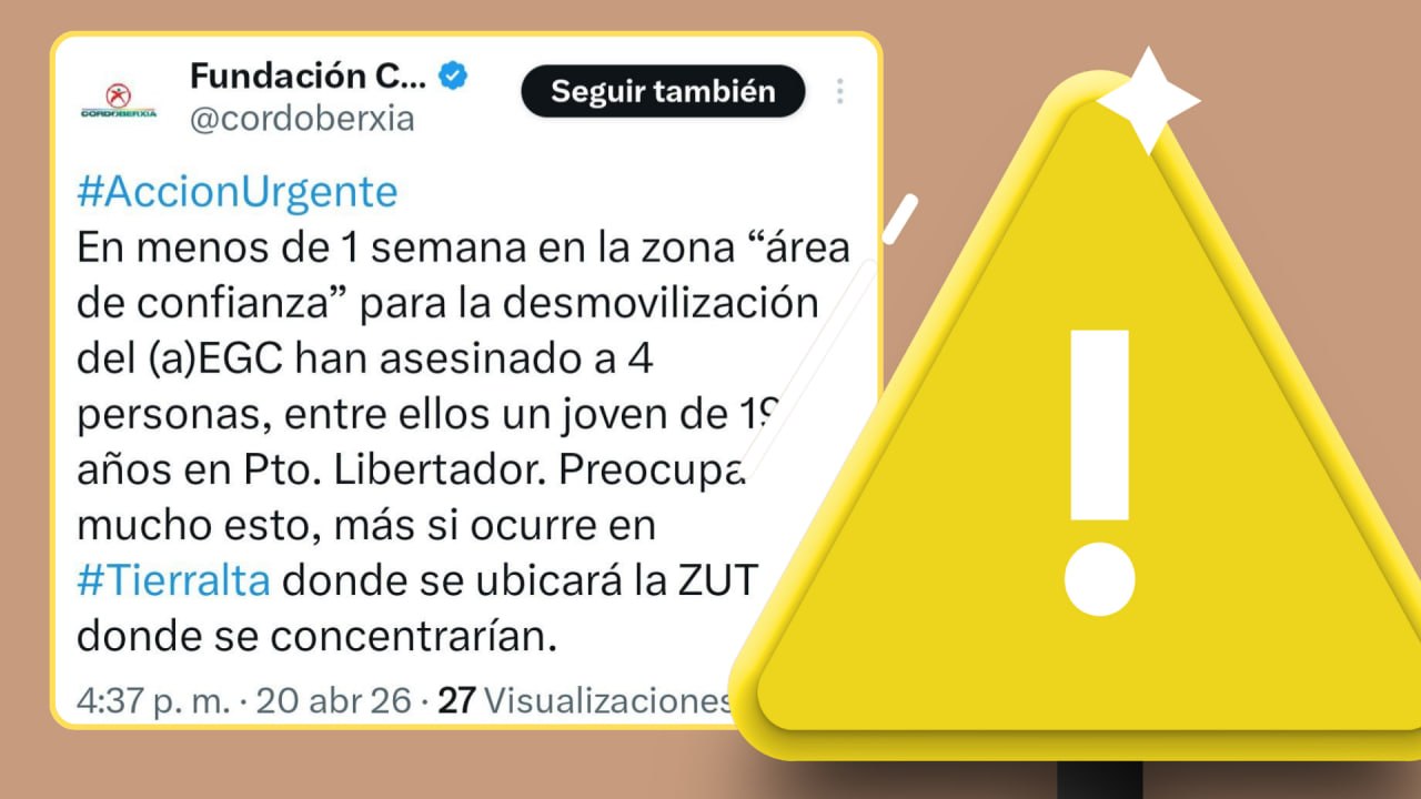 La Fundación Cordoberxia emitió una alerta urgente ante el deterioro del orden público en el departamento de Córdoba. Según informó la organización, en menos de una semana se han registrado cuatro asesinatos en el sector denominado como «área de confianza» para la desmovilización del grupo armado EGC.