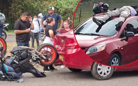 Aparatoso siniestro de tránsito en la vía Sincelejo – Corozal: Motociclista terminó sobre el techo de un automóvil tras fuerte choque