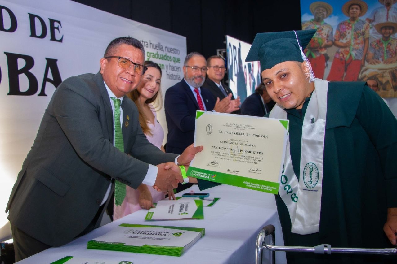 El rector de la Universidad de Córdoba, profesor Jairo Torres Oviedo, destaca, con el caso de Santiago y de muchos más que se evidencian en la institución, que esta alma mater ha hecho posible una política de inclusión que dignifica vidas, genera movilidad social y hace posible lo que se creía imposible.