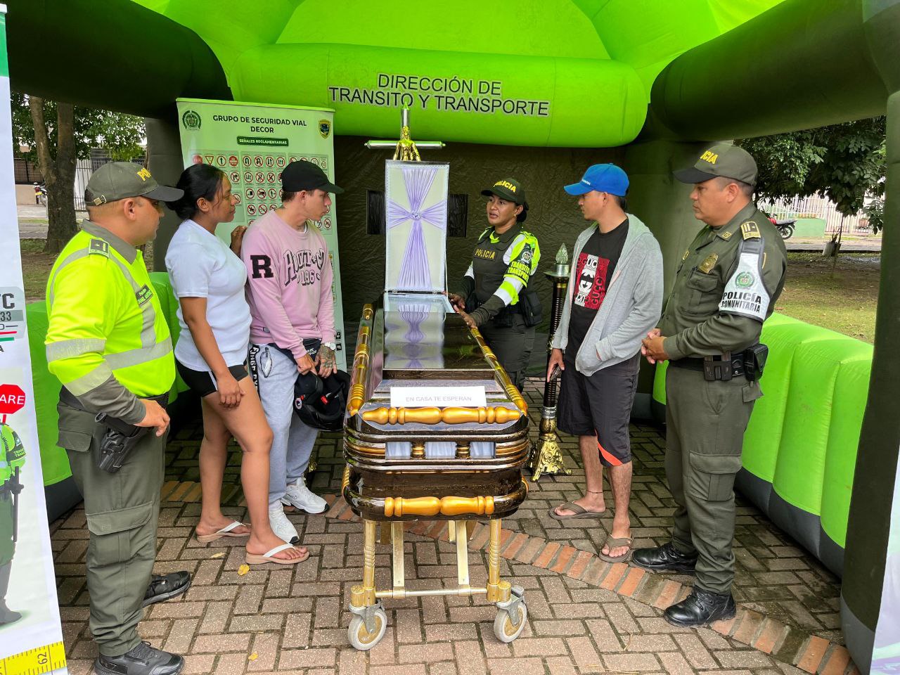 Durante la jornada, un ataúd simbólico fue instalado en una vía principal del sector, llamando la atención de conductores, peatones y motociclistas, quienes se detuvieron a escuchar el mensaje de los uniformados: la vida no tiene repuesto, en casa siempre hay alguien esperando.