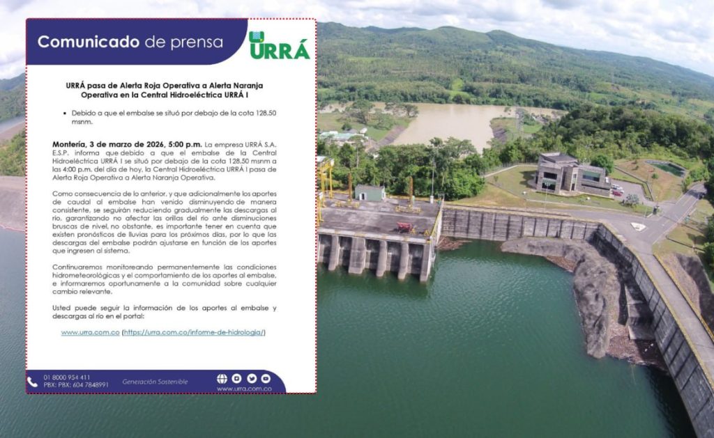 En un reporte emitido a las 5:00 p.m. de este martes 3 de marzo, la empresa URRÁ S.A. E.S.P. anunció el descenso de su nivel de alerta operativa, pasando de Roja a Naranja. La decisión técnica se tomó luego de que el embalse se situara por debajo de la cota de los 128.50 metros sobre el nivel del mar (msnm).