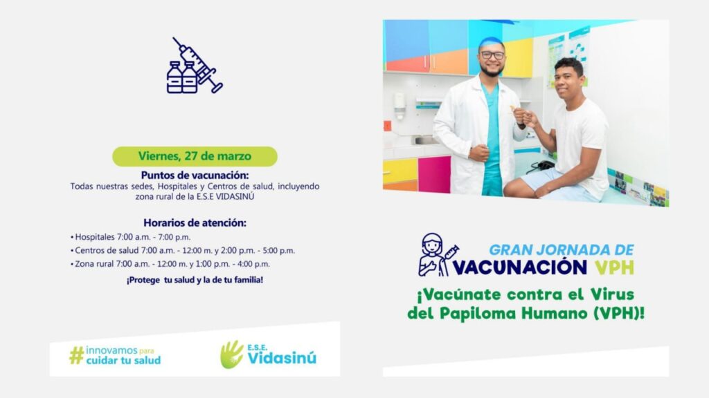 La E.S.E Vidasinú realizará hoy viernes 27 de marzo una gran jornada de vacunación contra el Virus del Papiloma Humano (VPH) en Montería, dirigida a niñas, niños y jóvenes entre los 9 y 17 años, con el propósito de fortalecer la prevención de enfermedades asociadas a este virus.