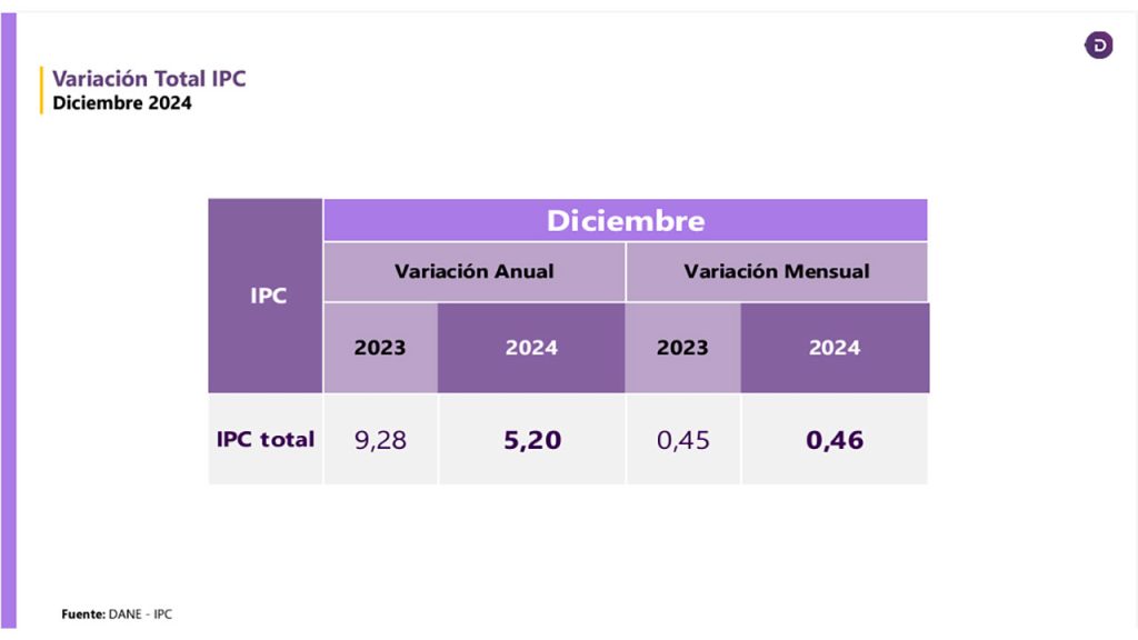 De acuerdo con Piedad Urdinola, directora del DANE, la variación de la inflación en 2024 ha sido la más baja desde 2021 cuando fue de 1,61 %, y se explica, principalmente, por la variación anual de las divisiones educación que registró la mayor variación anual con 10,6 %, seguida de la división Restaurantes y hoteles con una variación anual de 7,8 %; Alojamiento, agua, electricidad, gas y otros combustibles (6,9 %), Bebidas alcohólicas y tabaco (5,5 %) y Salud (5,5 %) se ubicaron por encima del promedio nacional (5,2 %).