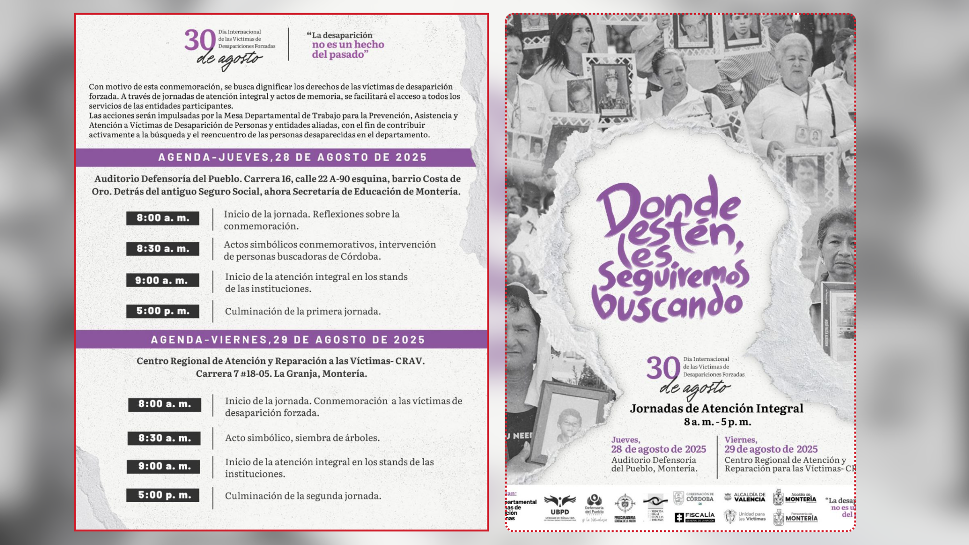 Con el motivo del Día Internacional de las Víctimas de Desapariciones Forzadas, que se conmemora cada 30 de agosto, diversas instituciones se unen en Córdoba para ofrecer una respuesta integral a las familias afectadas. La Mesa Departamental de Trabajo para la Prevención, Asistencia y Atención a Víctimas de la Desaparición y entidades aliadas han organizado dos jornadas de atención integral y actos de memoria para los días 28 y 29 de agosto.