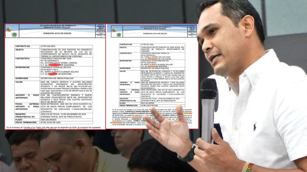 El mismo día, el alcalde firmó, además, el contrato LP-MT-020-2025, por valor de $6.174.519.991 pesos, con el CONSORCIA B&T PUENTES, para la “CONSTRUCCIÓN DE DOS PUENTES EN CONCRETO REFORZADO DE 30 METROS DE LUZ EN EL CORREGIMIENTO DE BATATA, EN EL MUNICIPIO DE TIERRALTA, DEPARTAMENTO DE CÓRDOBA”.