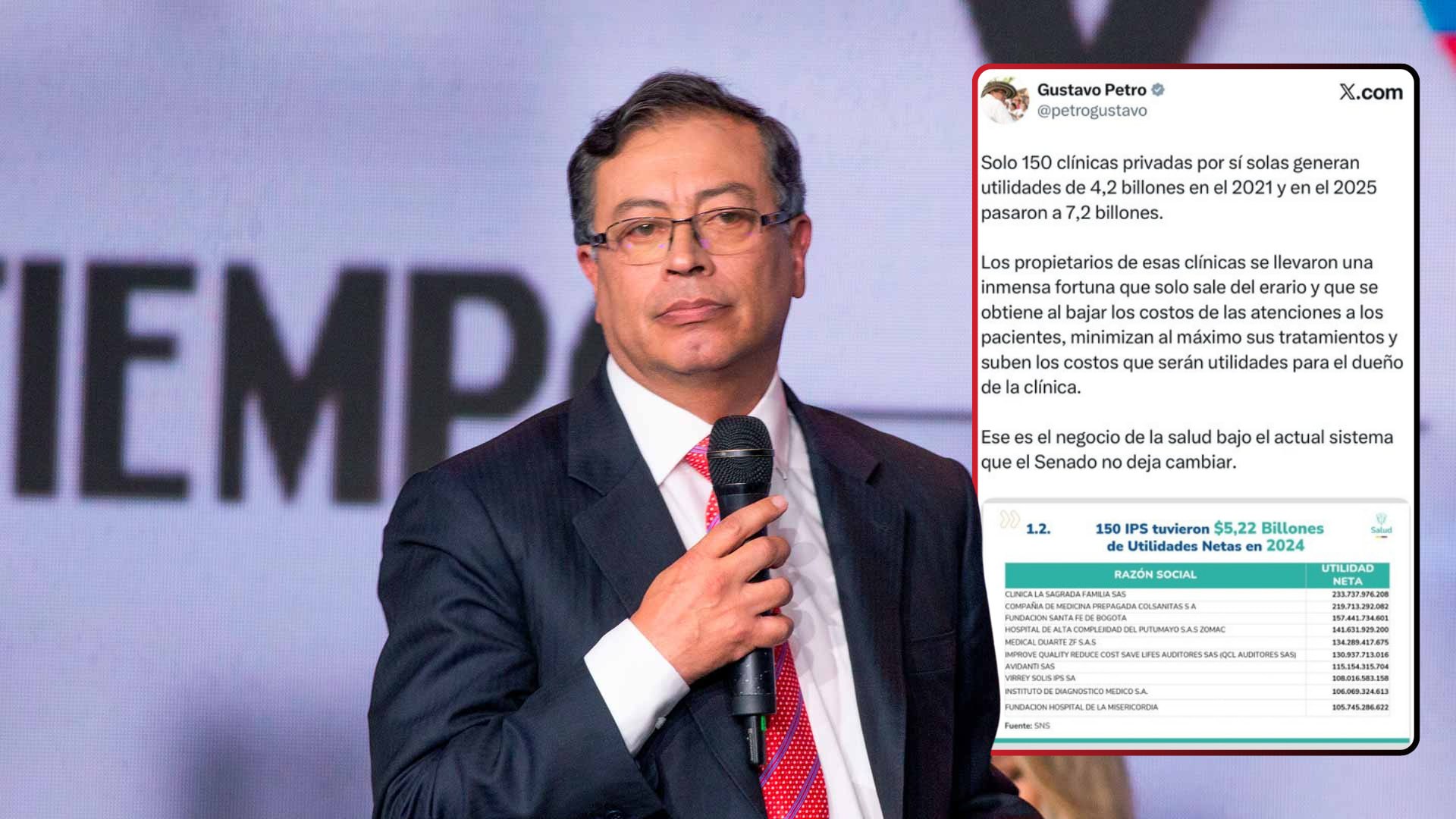A través de su cuenta en X, el presidente Gustavo Petro volvió a encender el debate sobre la reforma a la salud en Colombia. En una reciente publicación, el mandatario denunció lo que considera una acumulación desmedida de riqueza por parte de un sector de la red privada, a expensas de la calidad en la atención de los ciudadanos.