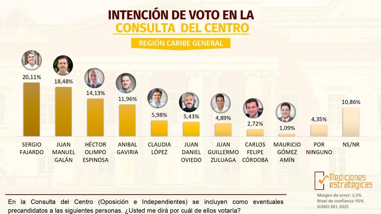 De acuerdo a los resultados Sergio Fajardo, con 20,11% y Juan Manuel Galán con 18,48% se disputan la intención de voto del Centro en el Caribe.