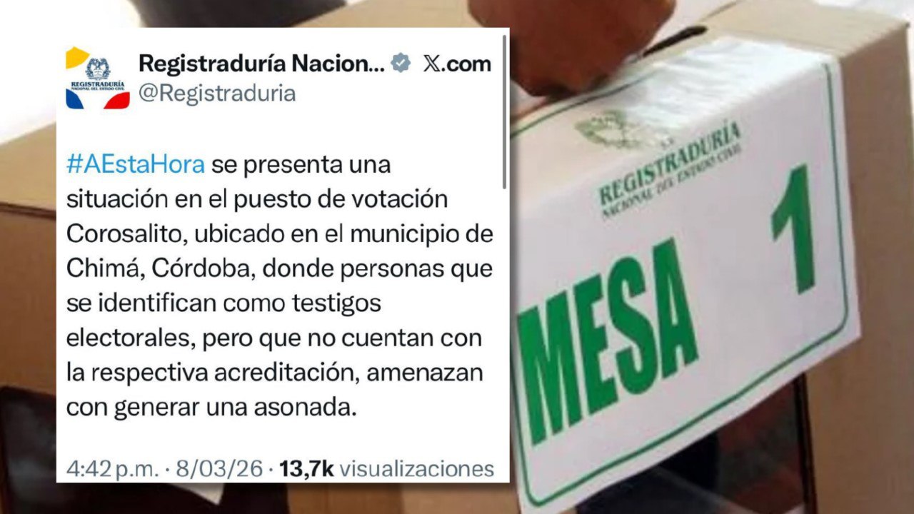 La Registraduría Nacional del Estado Civil reportó una delicada situación de orden público en el puesto de votación de Corosalito, jurisdicción del municipio de Chimá. Según el informe oficial, un grupo de personas que aseguran ser testigos electorales, pero que no presentan la acreditación legal requerida, ha generado disturbios en el lugar.